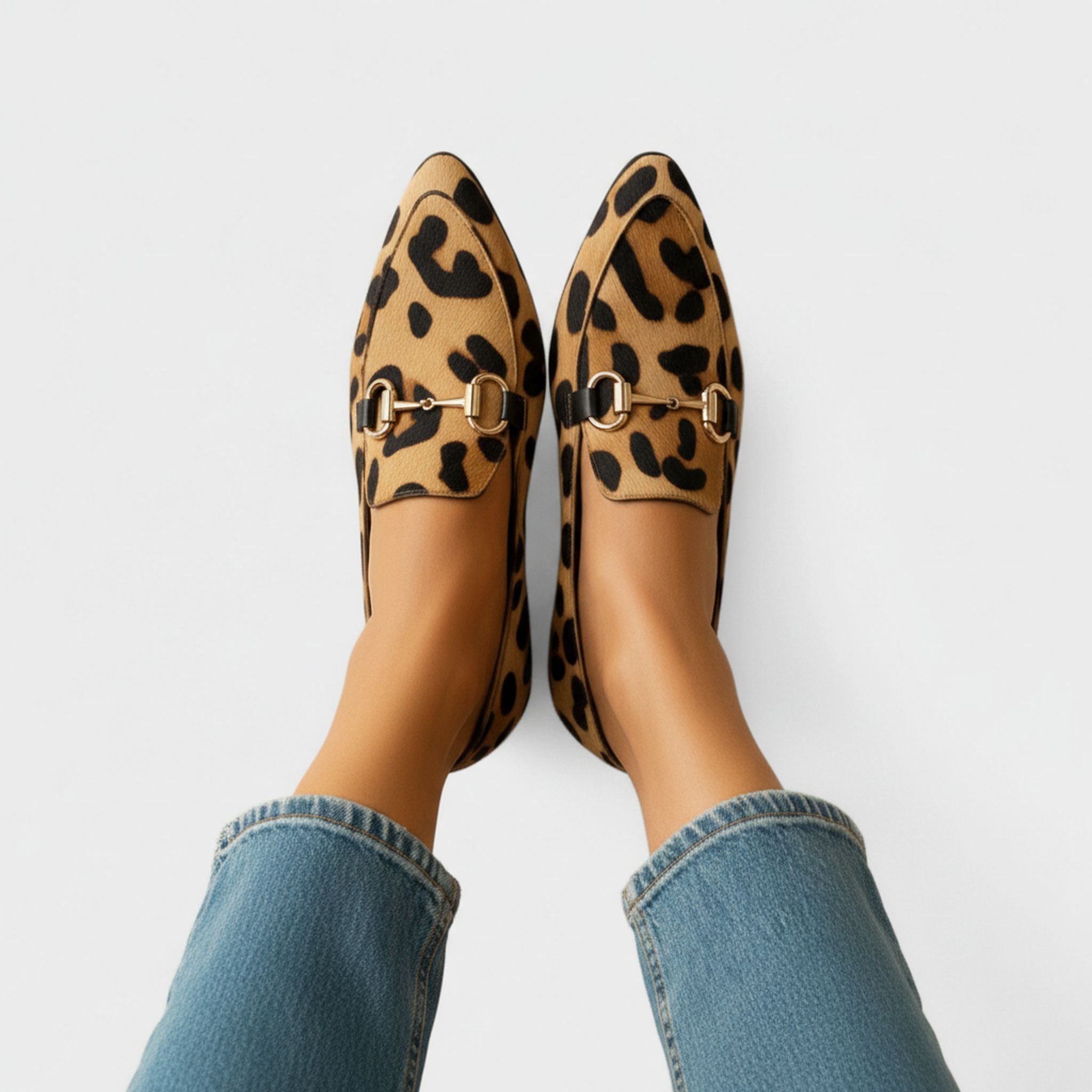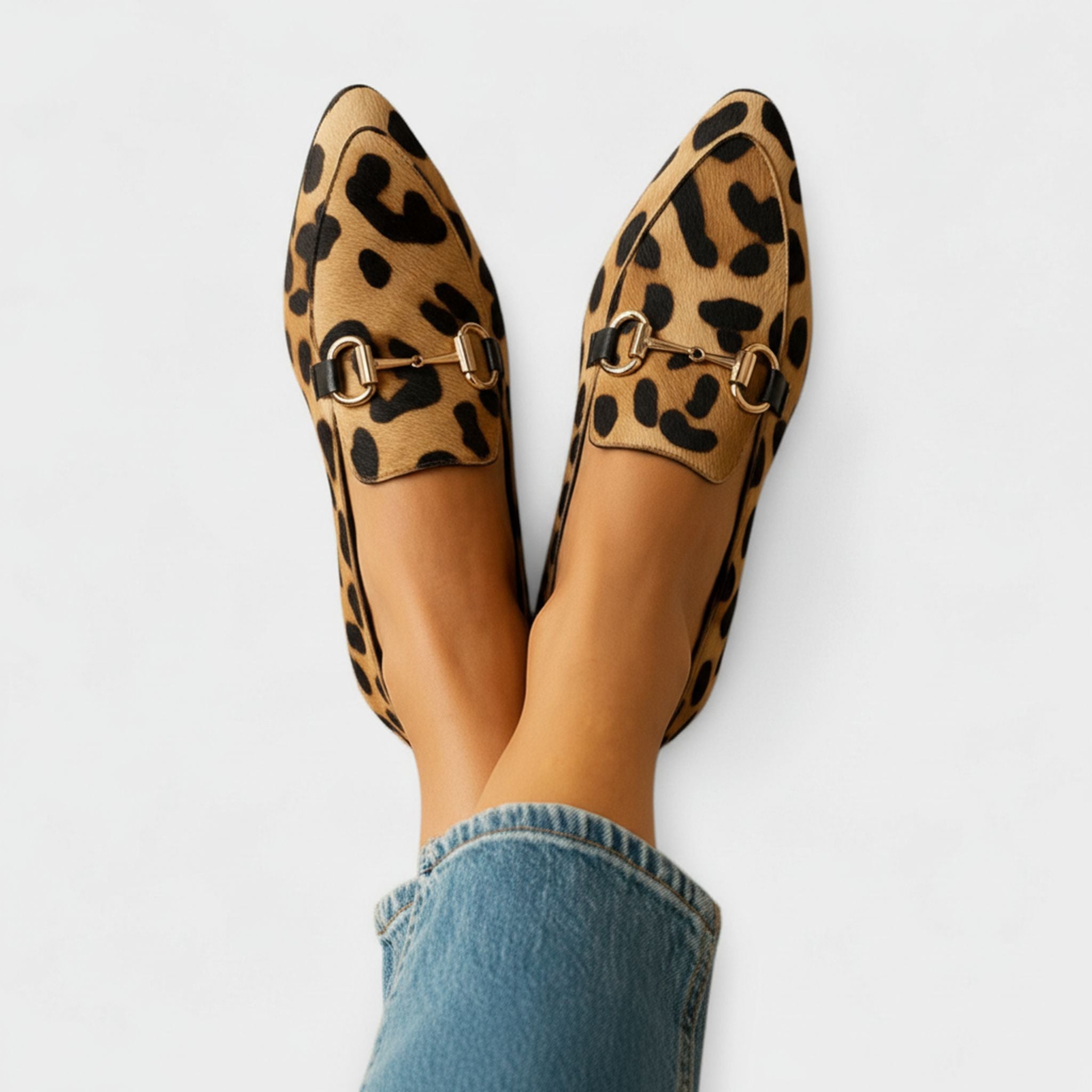 One (1) Pair of Leopard Print Loafers with Gold Horsebit for Women