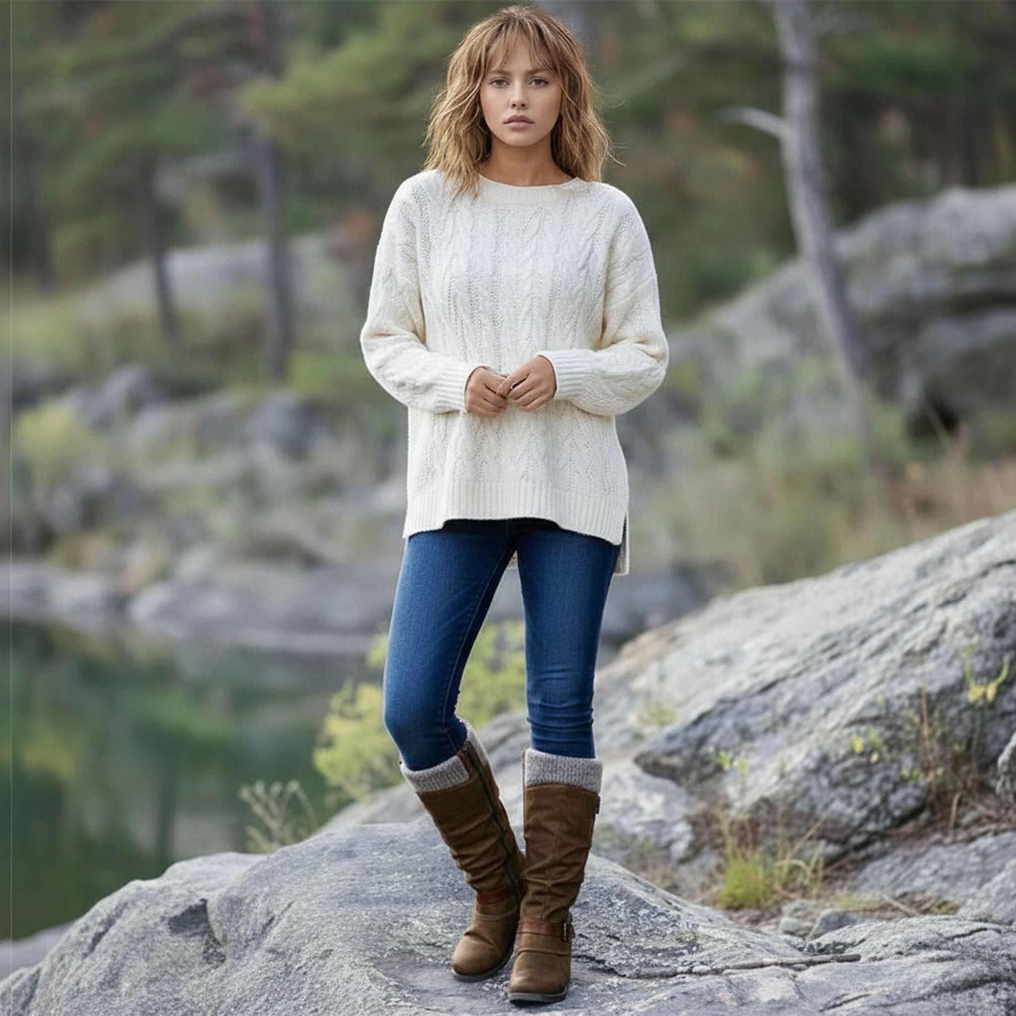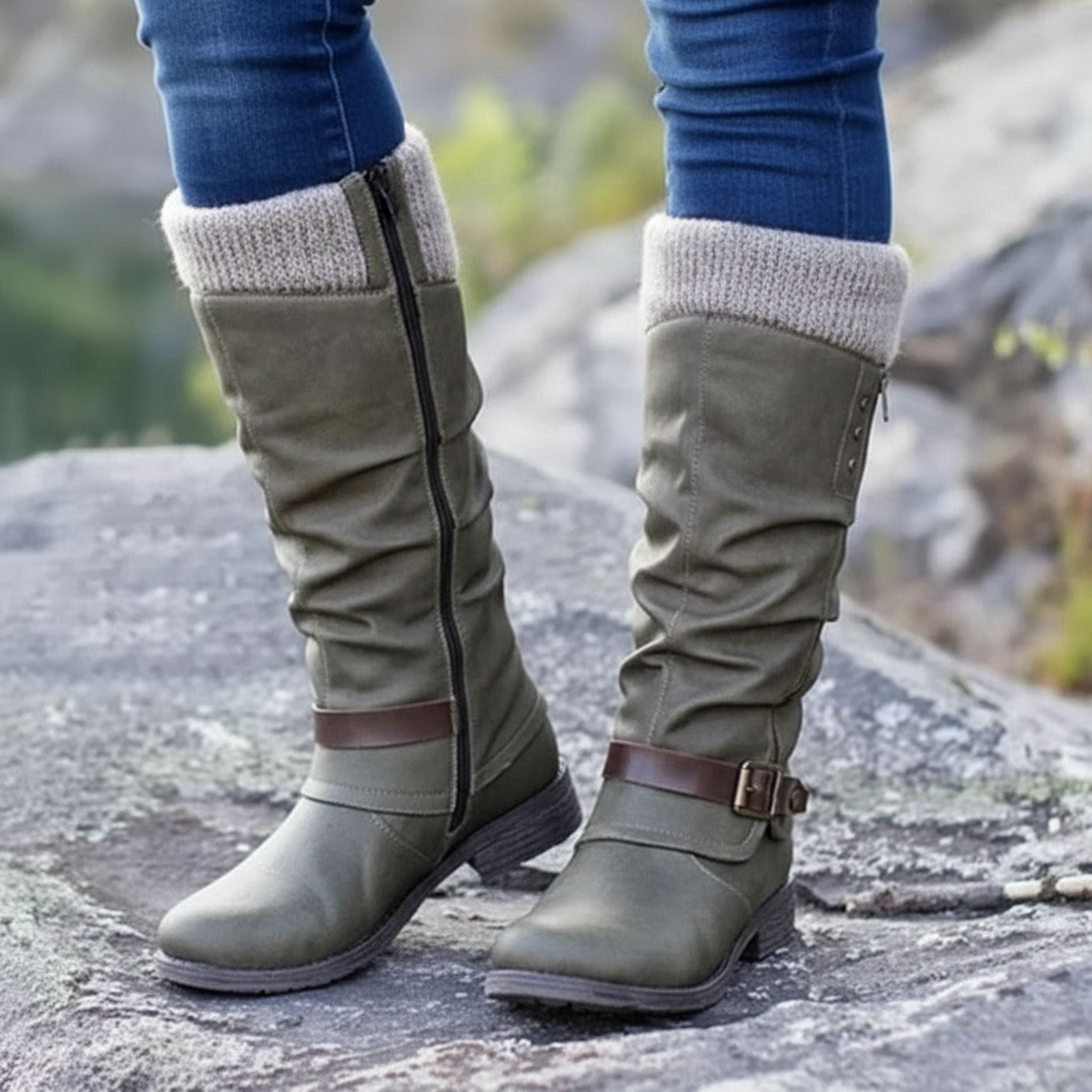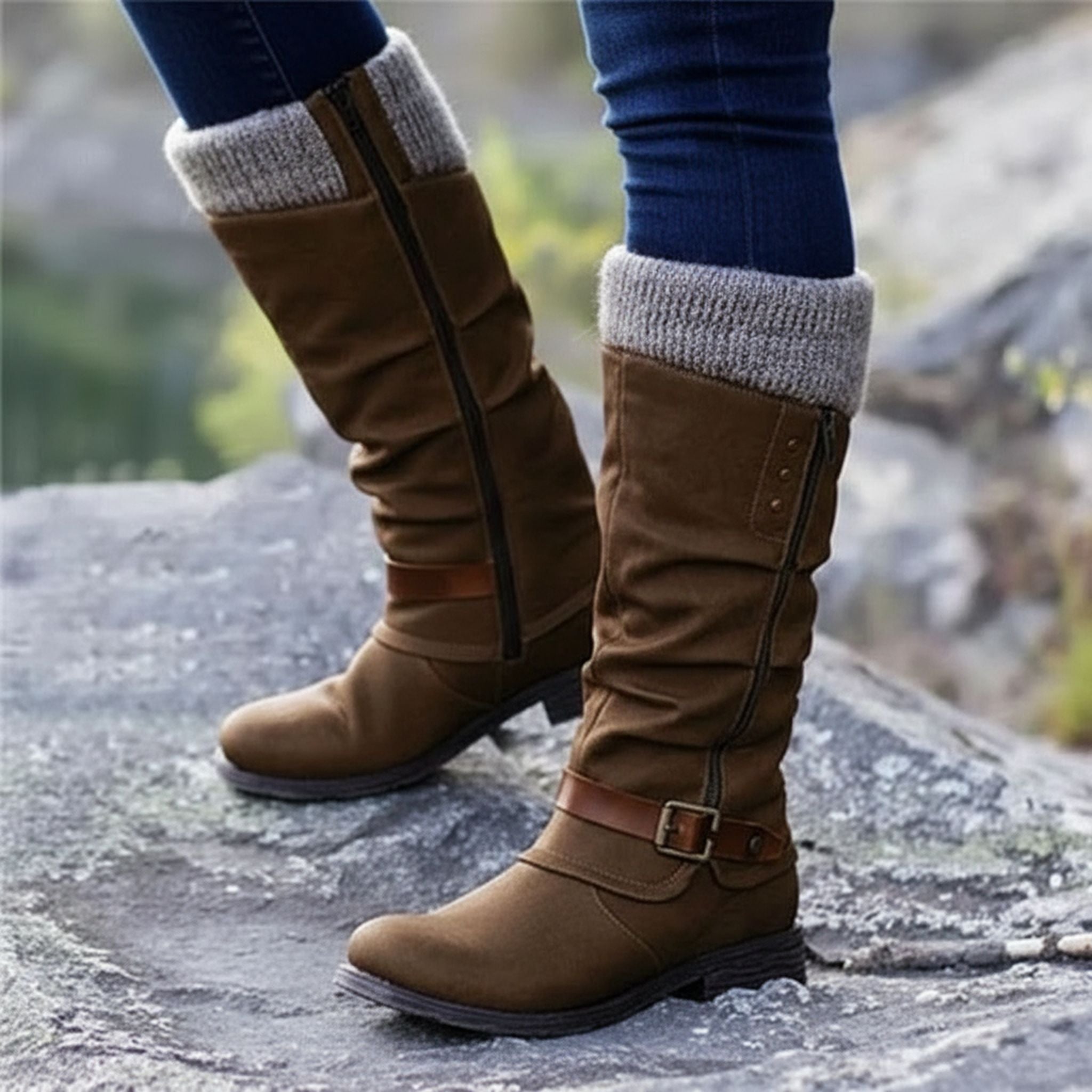 These women’s mid-calf boots are designed for comfort and stability during everyday wear. The soft upper material creates a relaxed, slouch-style look, while the knitted cuff adds a cozy touch suitable for cooler seasons. Decorative straps and buckles give the boots a classic, outdoors-inspired style that pairs well with jeans, leggings, and casual outfits.