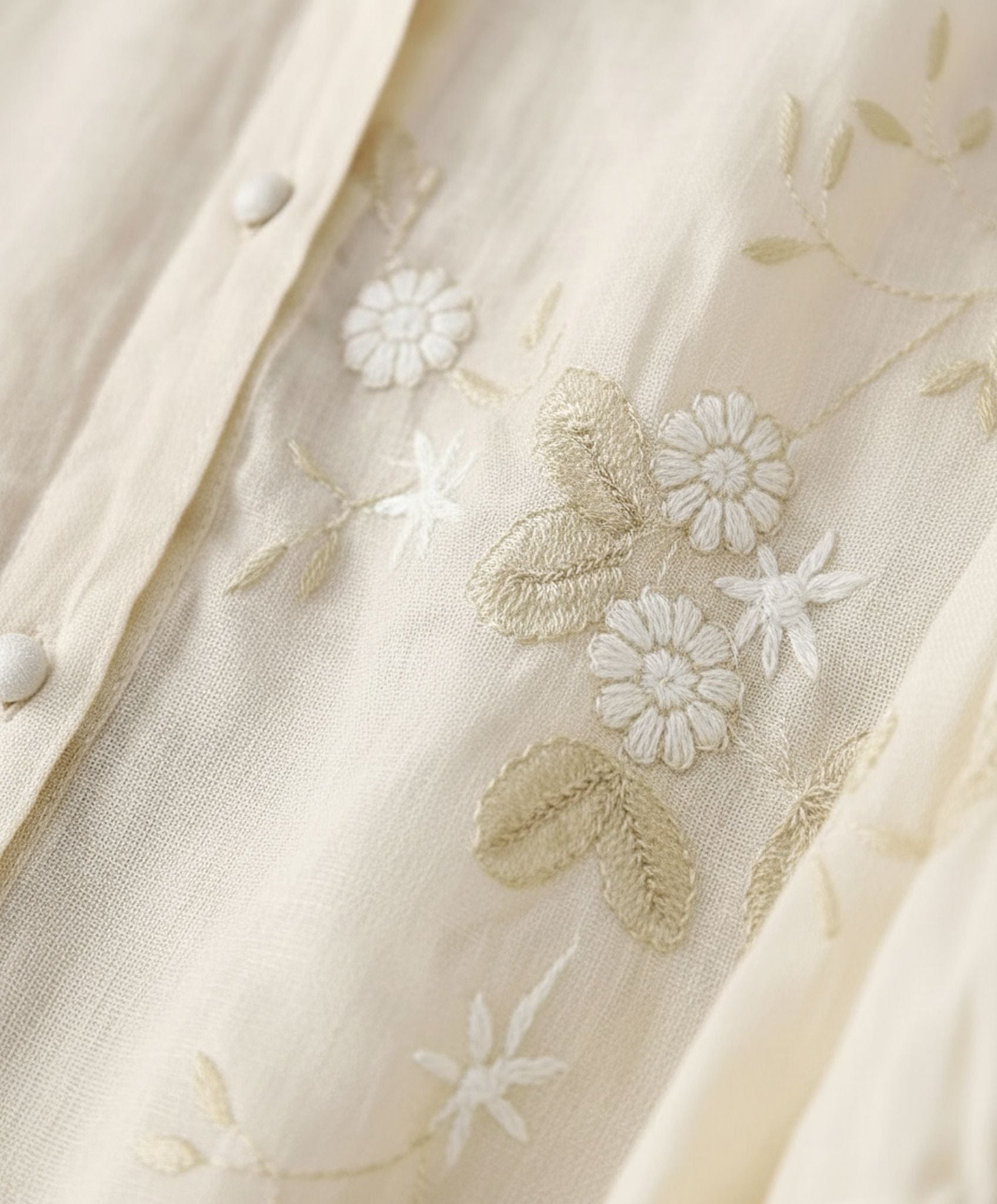 This embroidered cotton blouse features a soft, lightweight feel with delicate floral detailing for a simple, natural look. Its loose fit makes it comfortable for everyday wear, pairing easily with jeans, skirts, or relaxed trousers. The five-point sleeves add gentle movement and a laid-back style suitable for casual outings or staying comfortable at home.