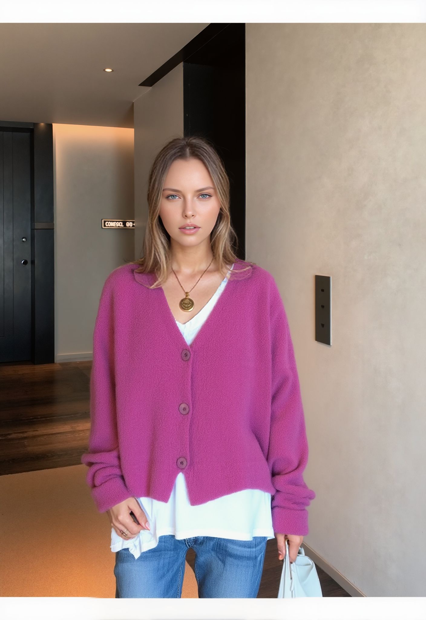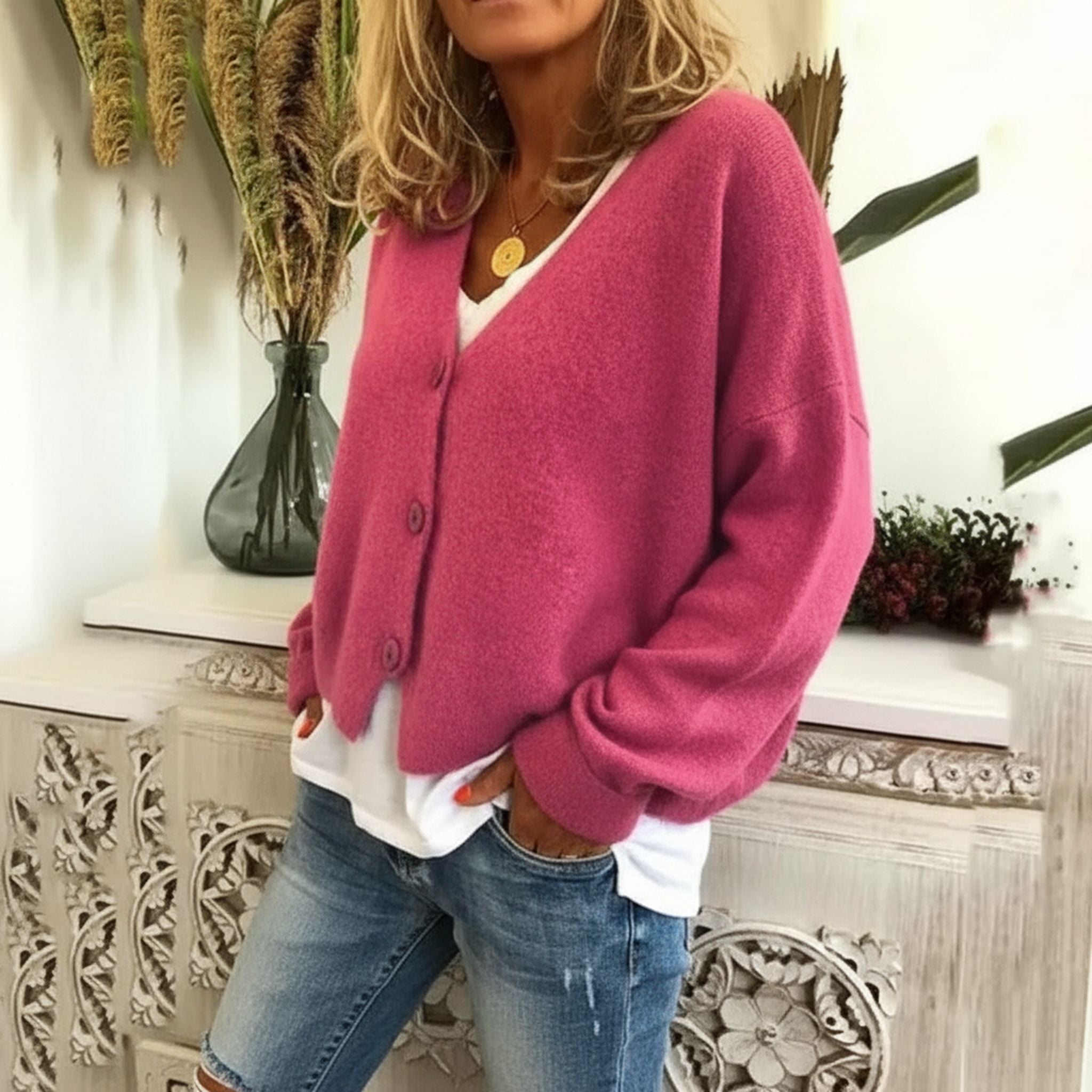 The cardigan features a V-neckline, long sleeves, and front buttons for quick and easy fastening. Available in a range of colors, it adds a soft layer that can be worn throughout the cooler seasons.