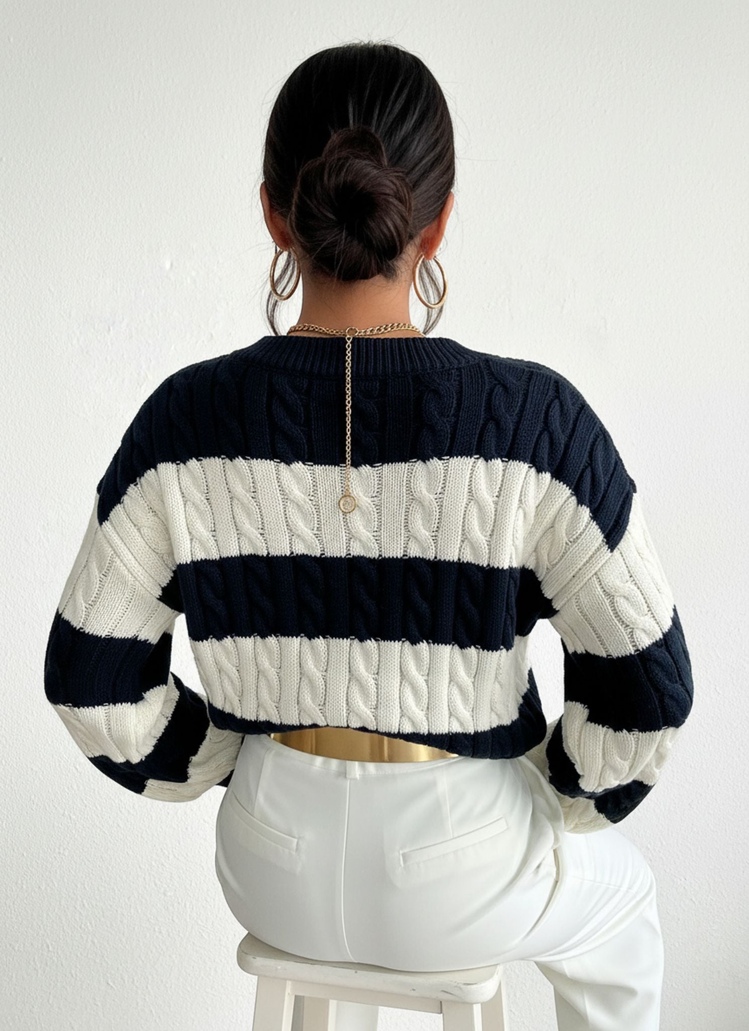 This striped V-neck sweater features a soft cable-knit texture and a relaxed, everyday fit. The bold stripe pattern gives it a clean, modern look that pairs well with jeans, trousers, or skirts. Its simple design makes it an ideal choice for casual wear during cooler days.