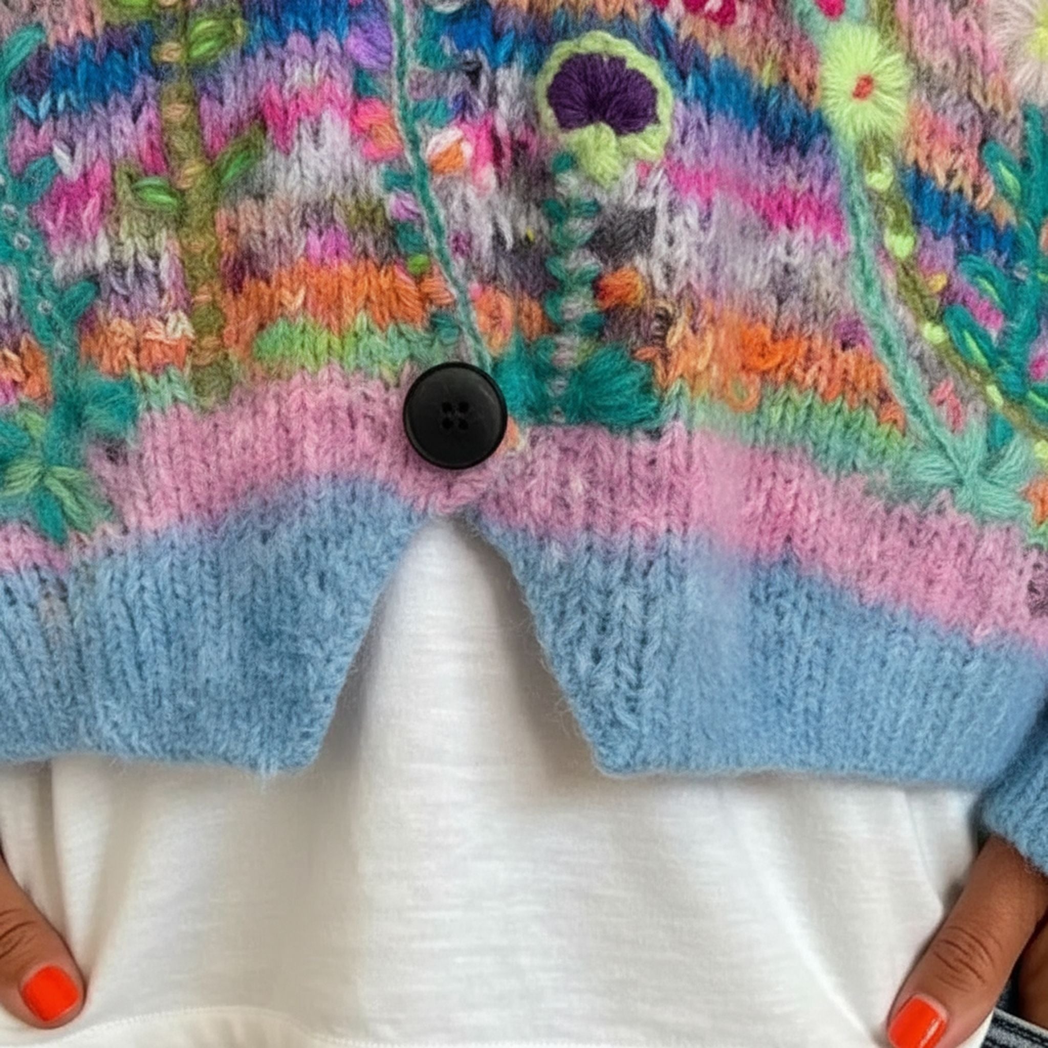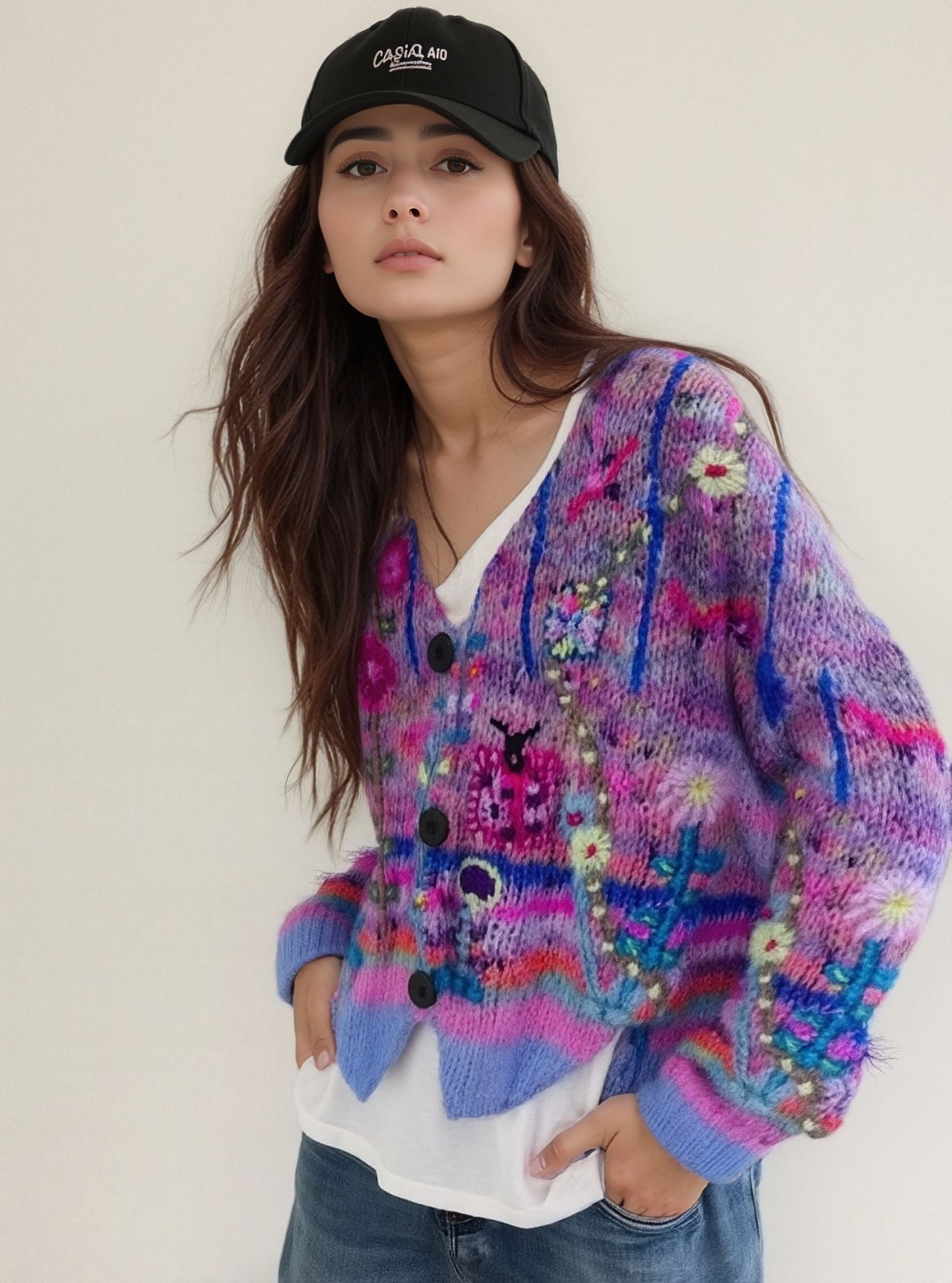 This floral print cardigan features a soft knitted texture and a colorful patterned design that brings a playful, artistic touch to everyday outfits. Its relaxed fit makes it easy to layer over T-shirts, long sleeves, or lightweight tops. The vest offers a cozy feel suitable for casual days at home or relaxed outings.