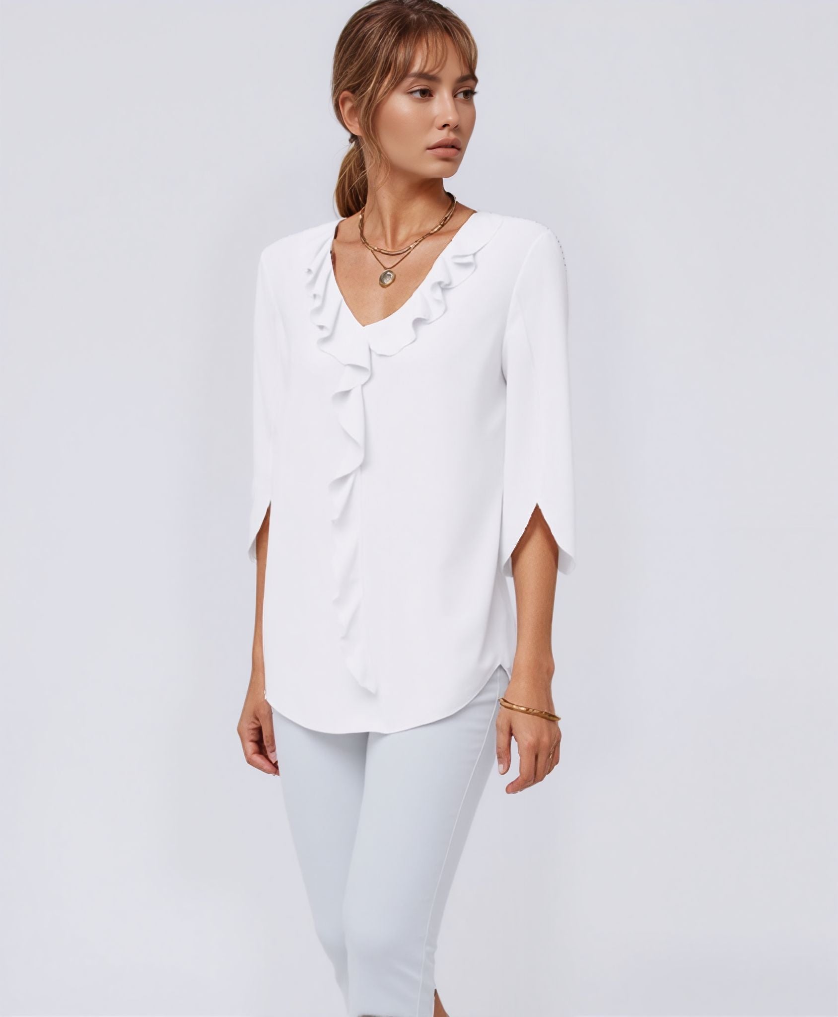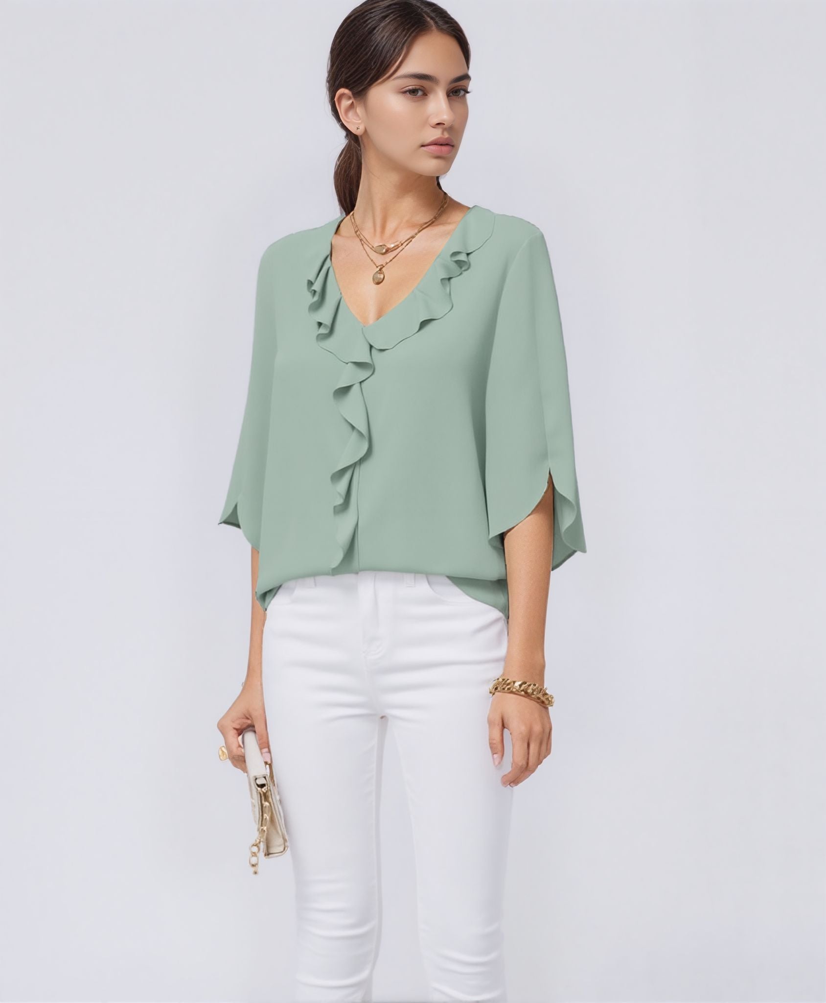 This ruffled V-neck blouse offers a light, feminine look that’s easy to style for everyday wear. The soft fabric and relaxed shape make it comfortable for casual outings, workdays, or weekend plans. The neckline's ruffle trim adds a subtle decorative detail without going overboard.