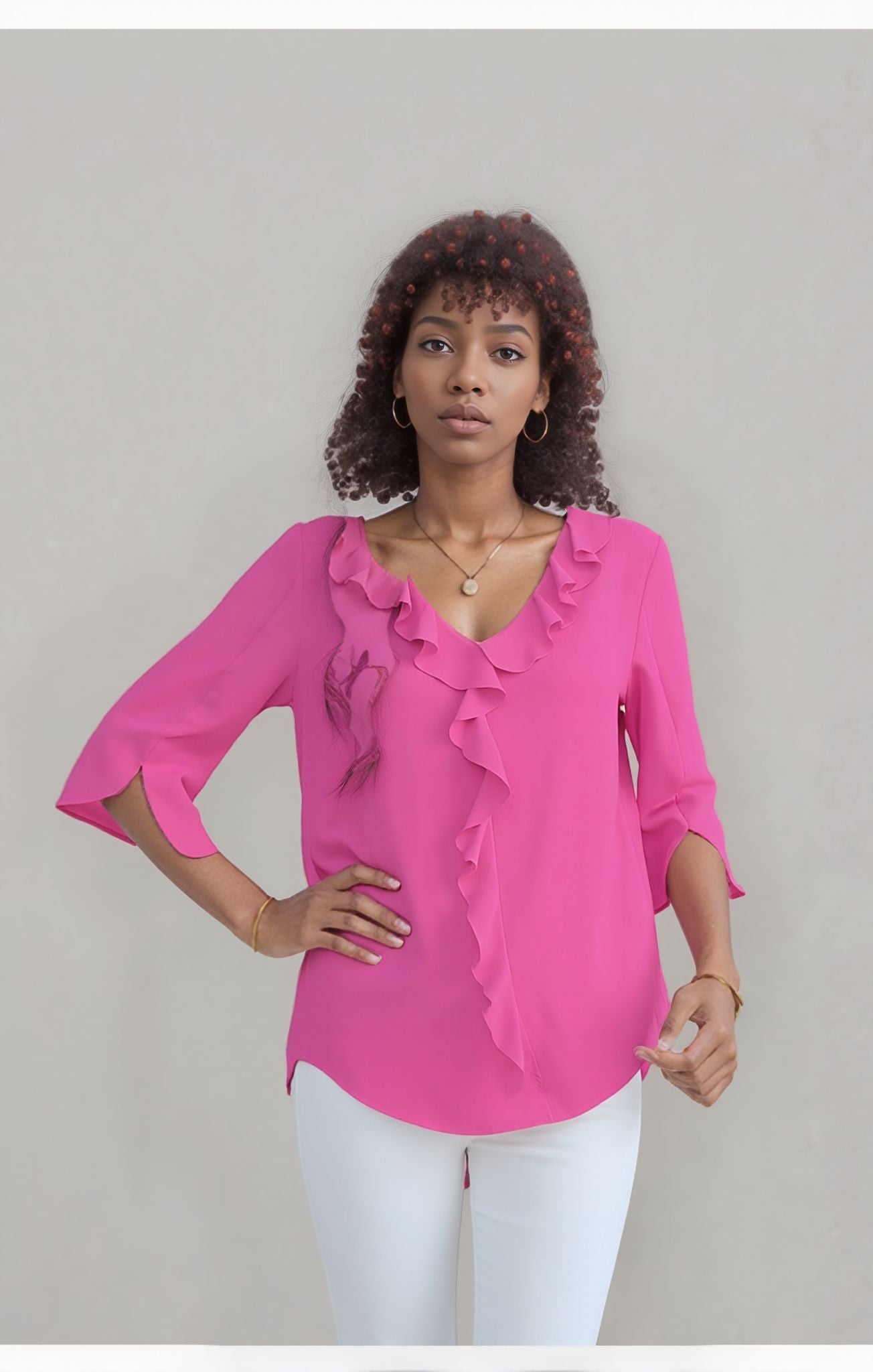 One (1) V-Neck Ruffle Trim 3/4 Sleeve Blouse for Women