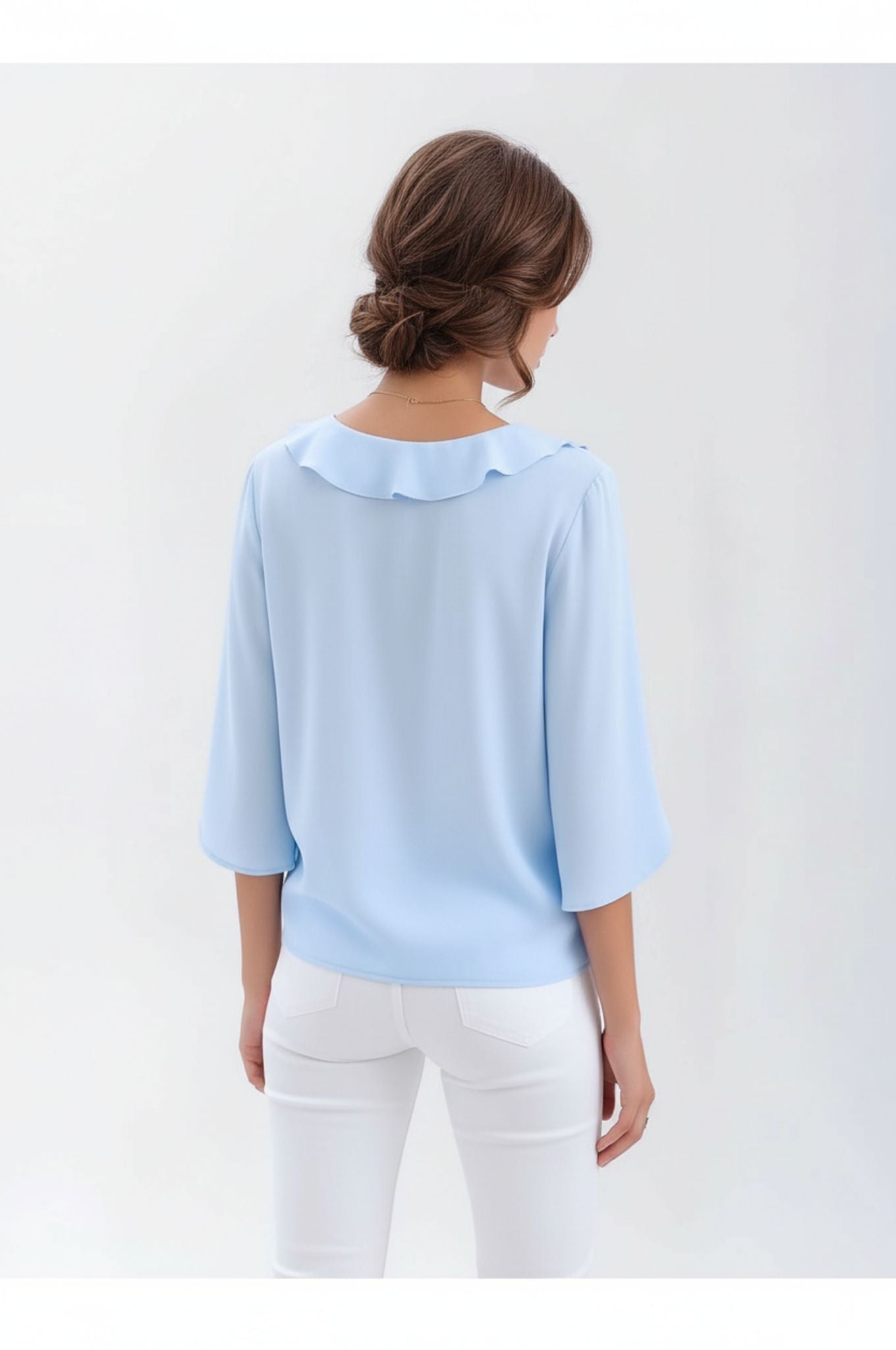 The three-quarter sleeves provide a simple, airy fit that works well across different seasons. Available in several colors, this blouse pairs smoothly with jeans, trousers, or skirts for a clean and versatile outfit.
