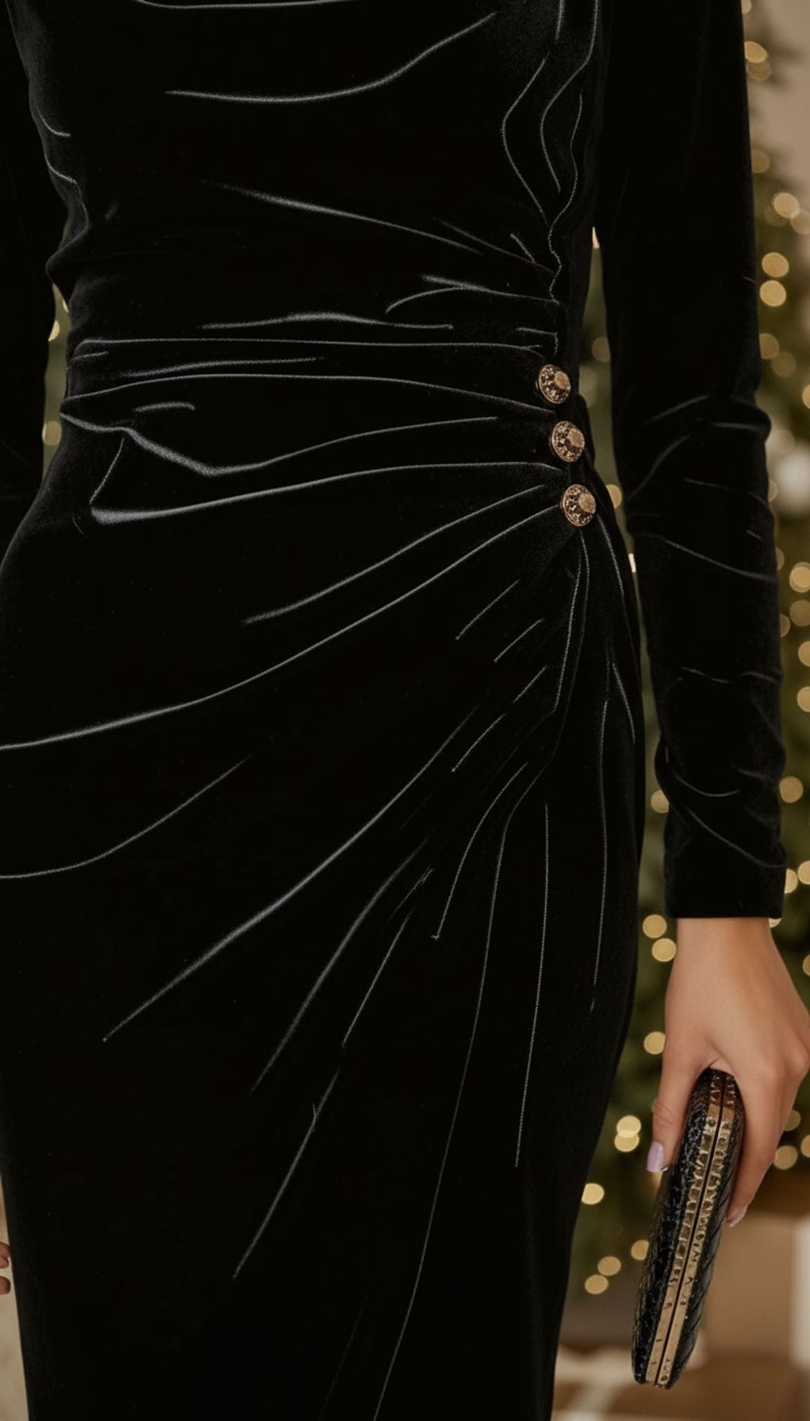 This velvet midi dress features a soft draped neckline and smooth ruched detailing that adds a refined touch to its simple silhouette. The long sleeves and comfortable stretch make it suitable for formal dinners, evening events, or seasonal gatherings. Its mid-length cut and side split create gentle movement while keeping the look polished and easy to wear.